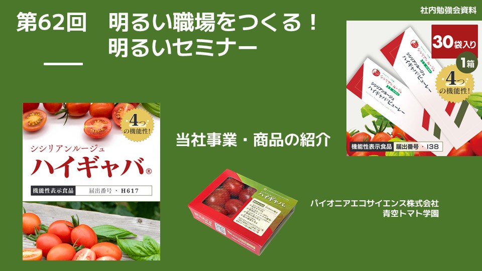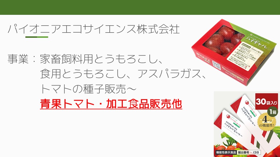 今日は、当社の成果、トマト、そして加工食品についてご紹介いたします。