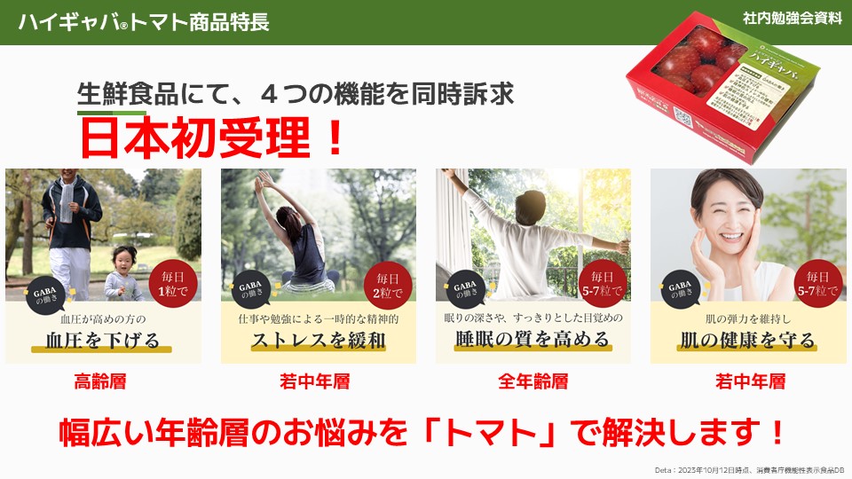 他社のトマトと比較してみると、我々のトマトは血圧を下げる機能があり、ミニトマト2個分(約13g)で十分な効果が得られます。しかし、他社のトマトではこの量では不十分です。また、精神的なストレス緩和についても、我々の製品は競合他社のものと比較して優れています。睡眠の質に関しても、他社の製品では350mgが必要ですが、我々の製品では一日の野菜摂取目標量に達する程度の量で十分です。」