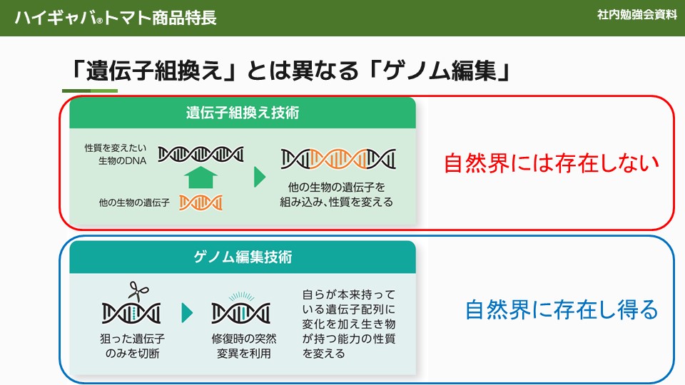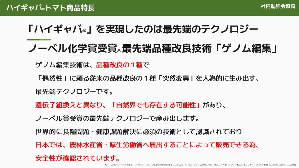 当社が使用している品種改良技術は、ノーベル科学賞を受賞した技術です。この技術はゲノム編集の一種であり、従来の品種改良と異なります。自然界に存在する可能性がある変異を人為的に引き起こす最先端のテクノロジーです。遺伝子組み換えとは異なり、自然界で起こりうる変異を再現しています。日本では、農林水産省と厚生労働省の承認を受けており、安全性が確認されています。