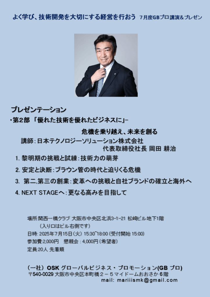 一般社団法人OSKグローバルビジネス・プロモーション(GBプロ)では隔月ごとに優秀な中小企業の経営者をおまねきし、その先駆的な経営、商品開発等の施策を紹介いただいています。