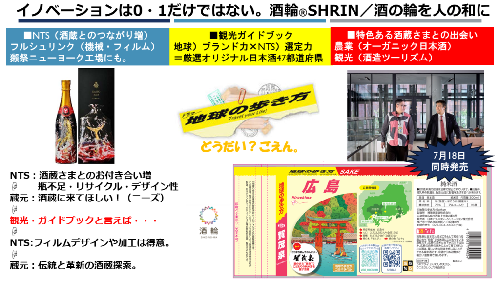 今、私たちが力を入れているのは、シュリンク包装で繋がりのあった酒造関係の方々との連携です。「何か新しい市場はないか」と考えていたところ、皆様もご存知のガイドブック「地球の歩き方」の編集長、宮田さんと偶然知り合いました。彼が日本版を出そうとしていると聞き、「日本酒なら地酒がたくさんあるじゃないか!」とひらめいたのです。