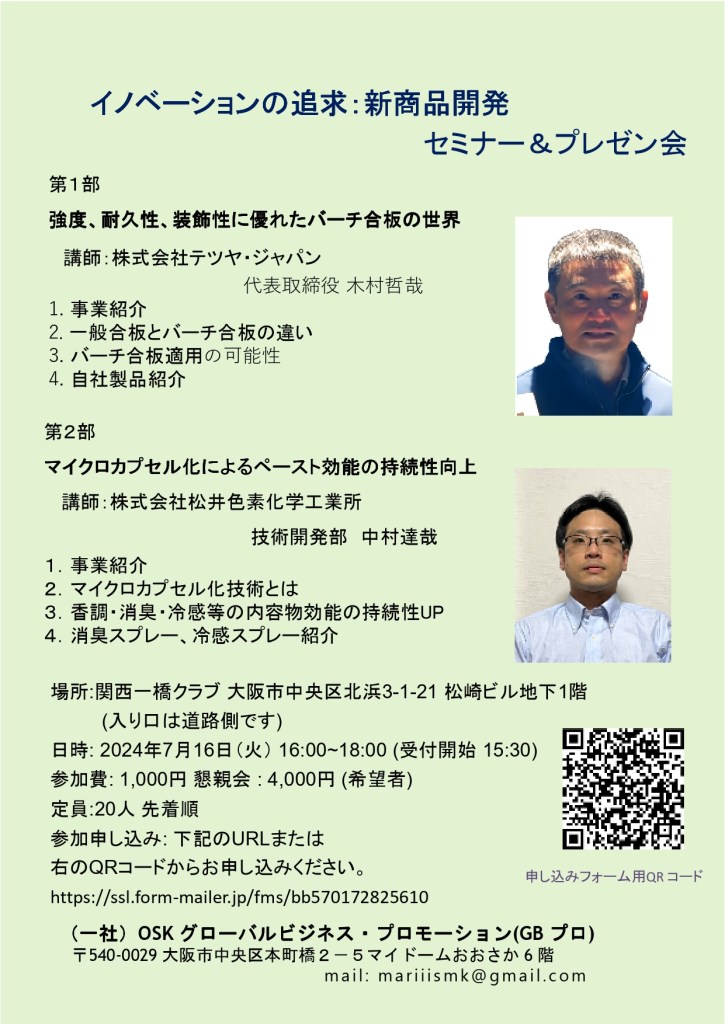 地球温暖化のせいか極端に暑い夏が続いています。その中で、OSKグローバルビジネス・プロモーション(GBプロ)では、7月にマイクロ・カプセル技術を適用して高性能の消臭・冷感スプレーを開発した(株)松井色素化学工業所技術開発部より中村達哉氏をお招きし講演をいただいた。