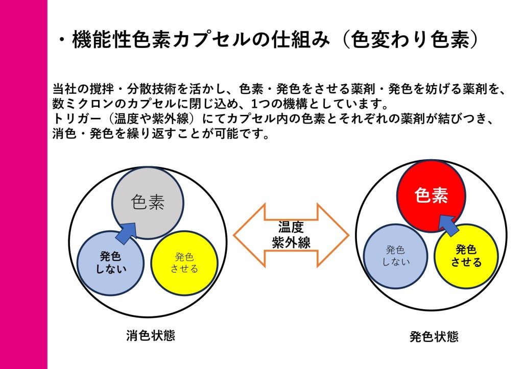 もともと、顔料を分散させる際に撹拌と分散の技術を用いてカプセル化していました。この技術を応用し、機能性色素を開発しました。具体的には、色素とその発色をコントロールする薬剤を1つのカプセルに封入し、数ミクロンサイズにまとめています。