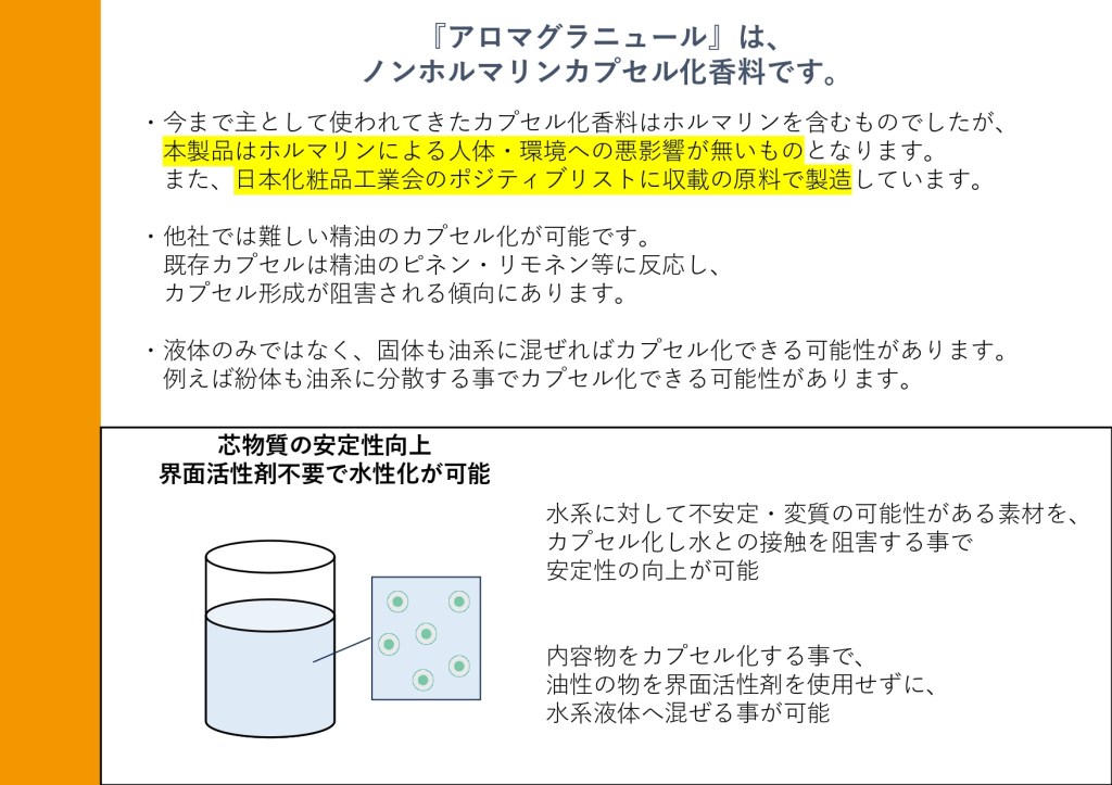 それでは、当社のアロマグラニュール技術についてお話しします。これは香りをカプセルに閉じ込める技術で、持続性や消臭効果を高めます。ノンホルマリンで、安全性を向上させました。