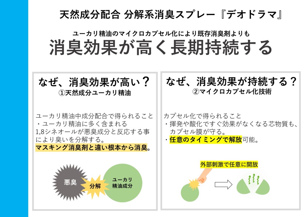 次に、消臭スプレーと冷感スプレーについてお話しします。当社の「デオドラマ」は、ユーカリ精油のマイクロカプセル化によって、既存の消臭剤よりも高い効果と持続性を実現しています。ユーカリ精油に含まれる18シネオールが、悪臭成分を分解・中和し、根本から消臭します。また、カプセル化によって揮発や酸化から精油を守り、任意のタイミングで効果を発揮できます。