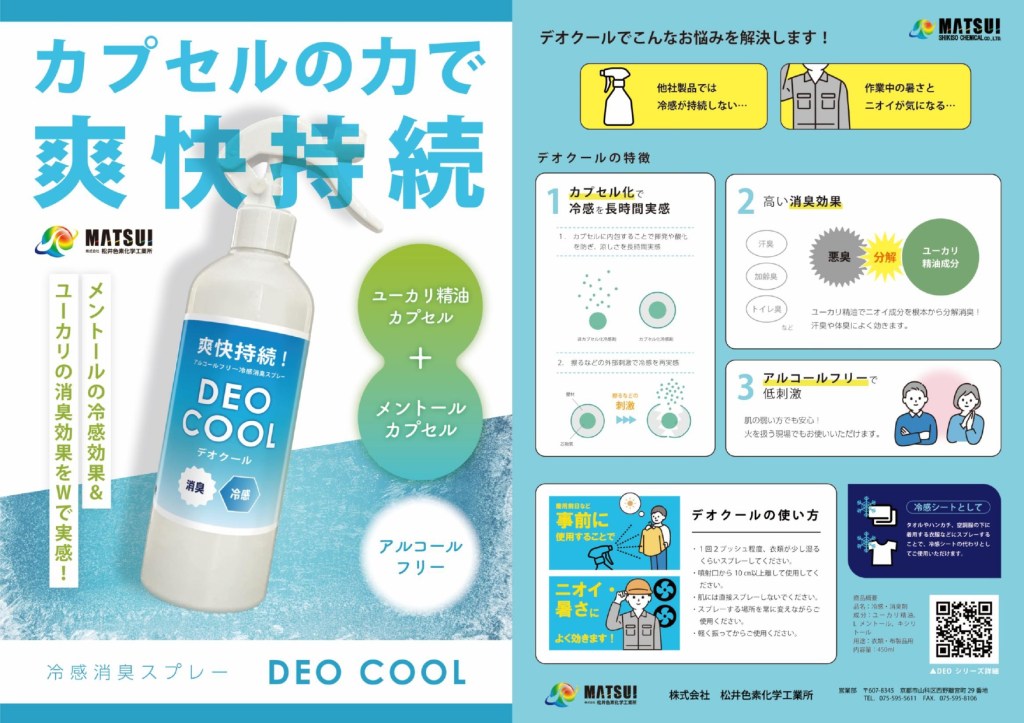 もう1つの製品「デオクール」についてご紹介します。こちらもカプセル化技術を活用したもので、ユーカリ繊維とメントールをカプセルに閉じ込めています。特に夏場の現場作業に最適で、作業服メーカー様で取り扱いいただいています。
