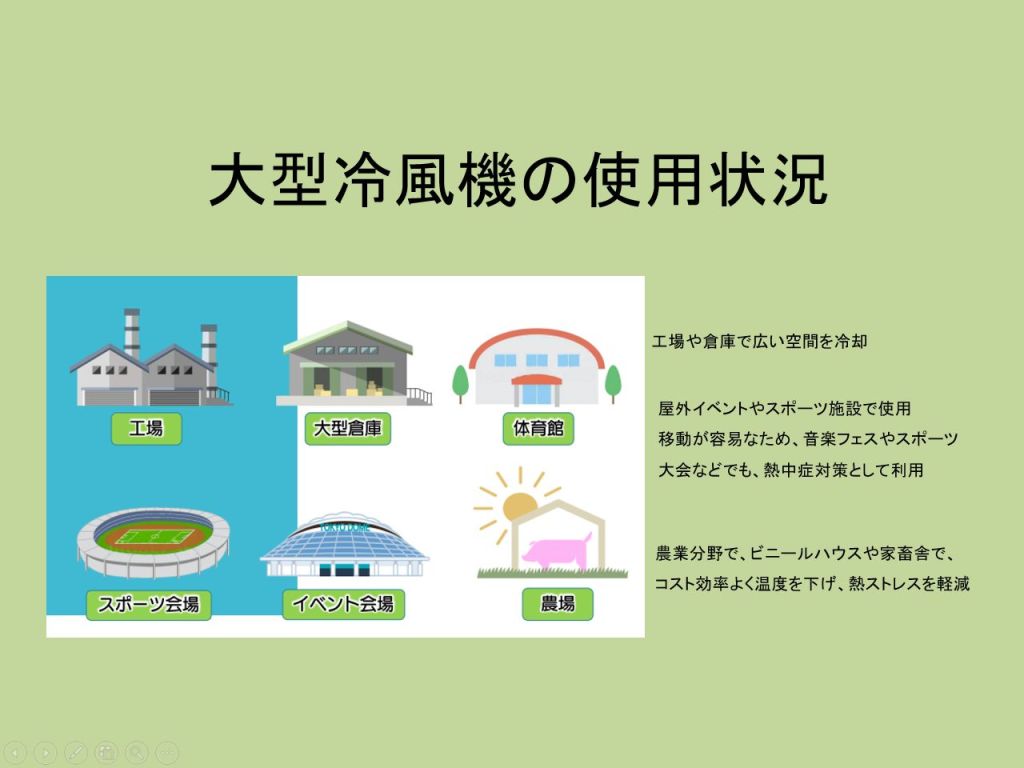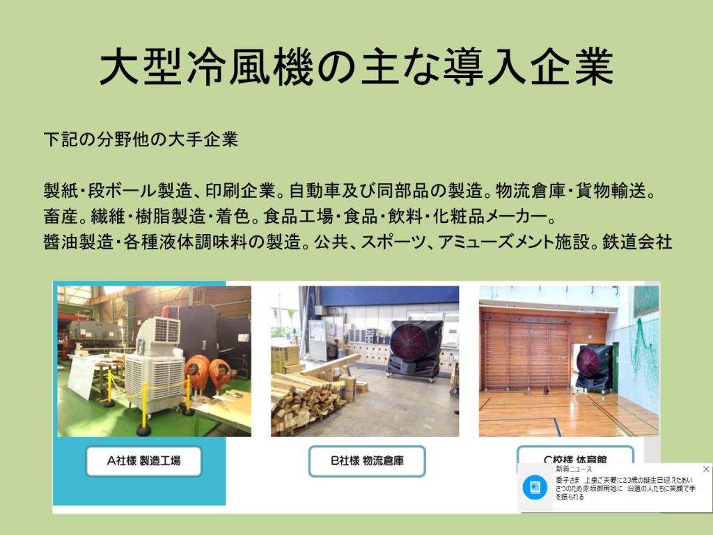 - 例えば、エアコン導入に2,000万円かかる工場で冷風機を600万円で設置した事例があります。