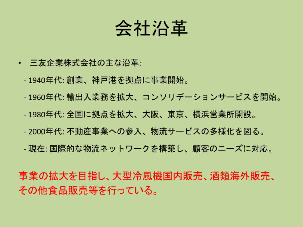 三友企業の曽根と申します。本日は大型冷風機のご紹介のため、お忙しい中お集まりいただきありがとうございます。最初に弊社の概要をご説明いたします。弊社は神戸を拠点とする物流サービス会社で、主に通関業務や輸送手配を行っております。輸送商材は新幹線やショベルカーなどの重量物から衣類や食品まで多岐にわたります。また、複数の貨物をまとめて輸送することでコスト削減を図るコンソリデーションサービスや港での貨物積み降ろし、不動産事業も展開しております。弊社は1940年代に神戸港を拠点に事業を開始し、1960年代に通関業務とコンソリデーションサービスを導入しました。現在では東京、大阪、神戸に営業所を構え、全国の港でサービス提供が可能です。2000年代以降は物流サービスの多様化に取り組み、不動産や食品の販売など事業を拡大しております。今回のメインは大型冷風機のご紹介ですが、弊社は通関業務、輸送機器の手配、倉庫保管にも対応しております。貿易や物流に関するご相談もお待ちしております。本日はある大型冷風機についてご紹介いたします。最後までご清聴よろしくお願いいたします。