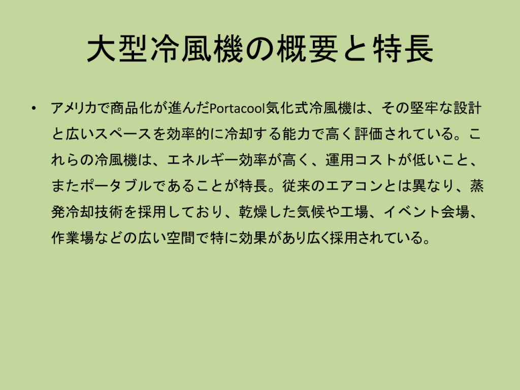 本当に長い、暑い今年の夏が過ぎました。来年もまた同じように暑い夏がやってくるかもしれません。それに備える意味でOSKグローバルビジネス・プロモーション(GBプロ)では、三友企業(株)をお招きし大型空間で省エネで、威力を発揮する大容量冷風機の紹介をお願いしました。以下はその発表概要です。