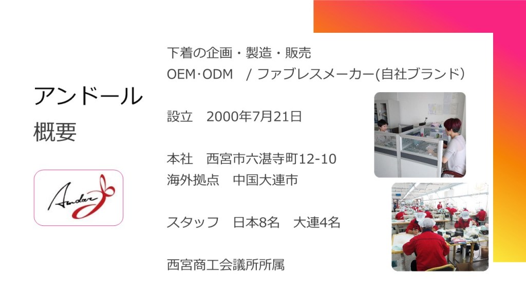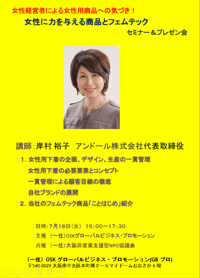 一般社団法人OSKグローバルビジネス・プロモーションでは、7月18日、一般社団法人大阪府産業支援型NPO協議会との共催で二人の女性経営者をお招きし、セミナー&プレゼン会を催しました。以下は、そのうちの一人、アンドール株式会社代表取締役、岸村裕子様の発表概要です。