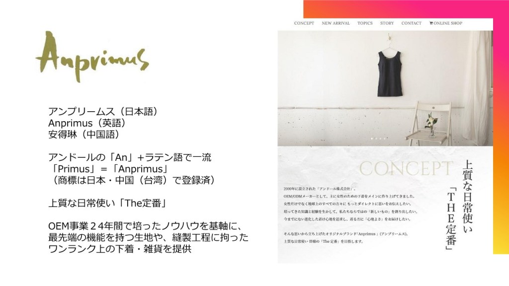 これは、アンドールの「アン」と、ラテン語で一流という意味の「プリームス」との造語です。一流を目指そうと名付けました。