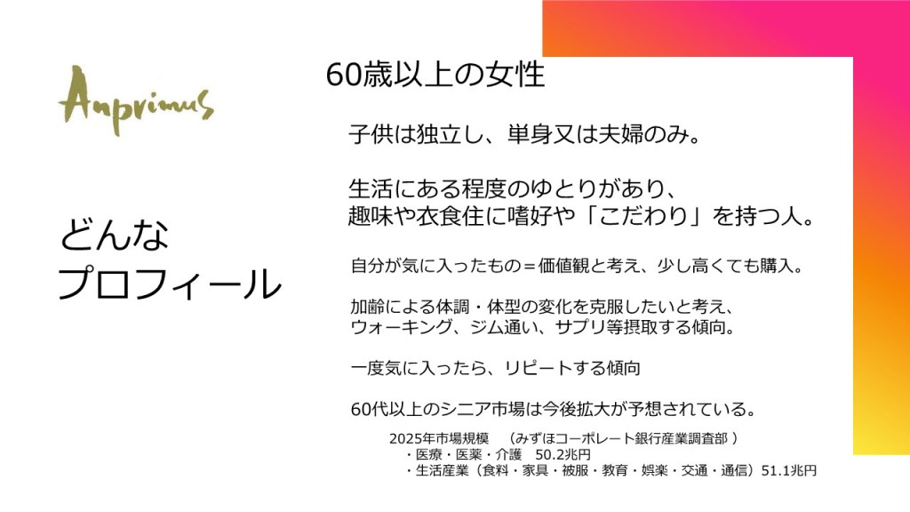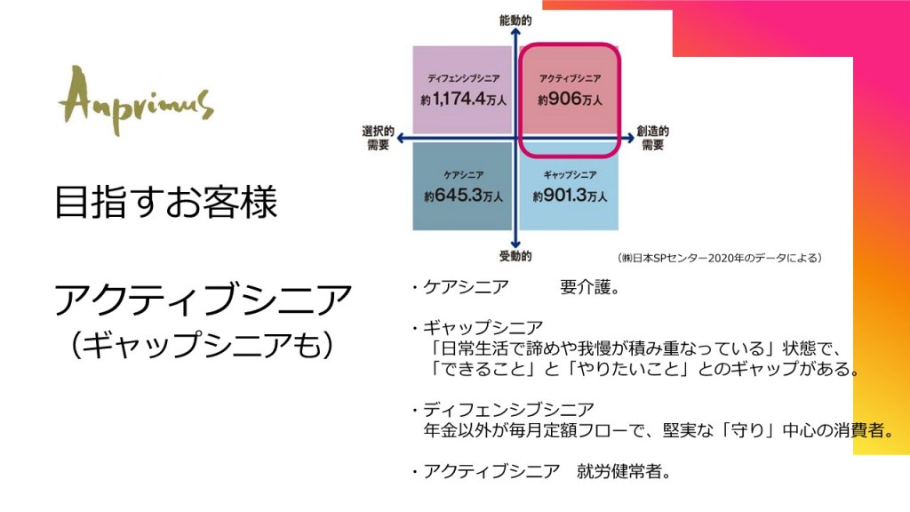 アンプリ―ムスが目指しているお客様は、シニアの方々です。