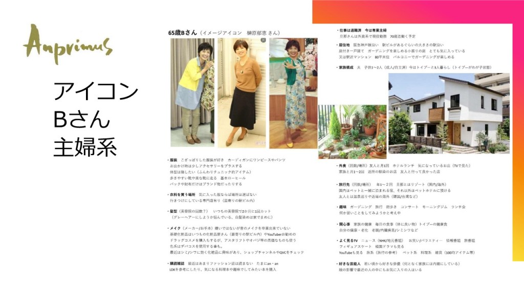 もうひとり、Bさんは主婦の方なんですが、この方は「榊原郁恵さん」がアイコンになっています。さっきのAさんは通勤があるので、どちらかというと都心部に近いところにお住まいなんですが、Bさんは主婦なので、郊外の一戸建てにお住まいです。ガーデニングなんかが趣味で、どういうところでお洋服買ってみたいなことを一つずつ分析しています。