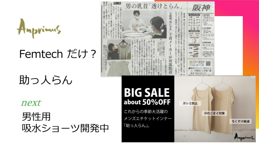 男性用については、以前「助っ人らん」という商品を販売したことが有ります。男性の乳首がワイシャツから透けて見えるのが気になる方に向けて、「透けない」という言い方をもじって「助っ人らん」と名づけ、好評を頂きました。そういう経験がございますので、男性用でも開発できると思っております。