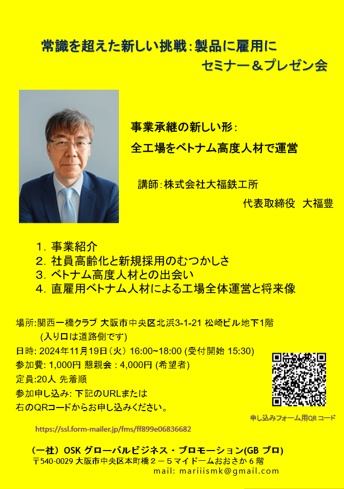 少子高齢化が進む日本、そして中小企業での、とりわけものづくりにかかわる新規採用は厳しい状態が続いています。このような中で顔国人雇用が必須の傾向がみられます。OSKグローバルビジネス・プロモーション(GBプロ)では先駆的な外国人活用を行っておられる大阪府豊中市の大福鉄工所の大福社長においでいただきお話をいただきました。