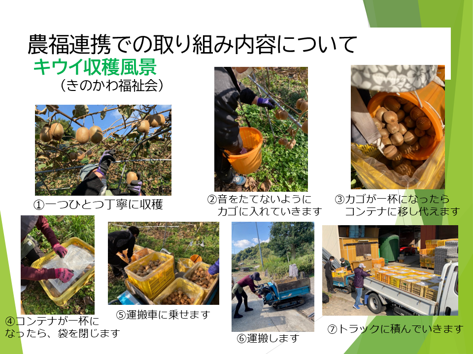 キウイやジャバラの収穫を、地元の障がい者福祉施設の利用者の方々に手伝っていただいています。**「出来高制」**を導入し、無理のない範囲で働ける仕組みを作っています。