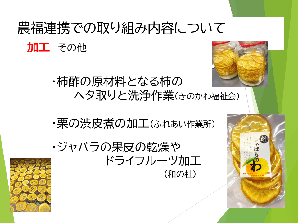- 農福連携として、障害者福祉施設と協力し、果実の収穫や加工を分業