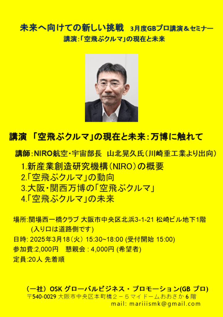 3月にこのスタートに先立ち、大阪府とも関連ある団体(一社)OSKグローバルビジネス・プロモーションでは新産業創造研究機構(NIRO)の航空・宇宙部長の山北氏をおまねきし、講演をお願いしました。